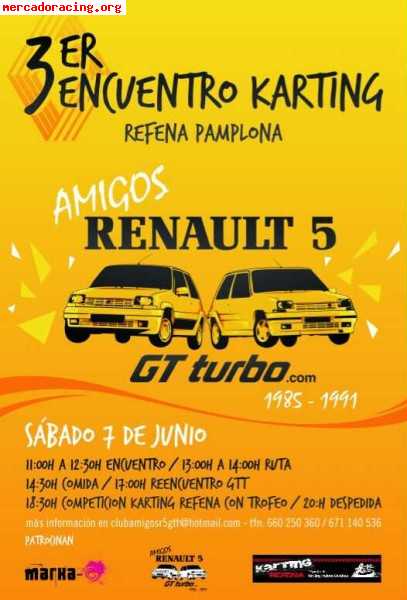 11:00-12:30 Encuentro de los Renault participantes.13:00-14:00 Realización de ruta con los coches.14:30 Comida.18:30 Competición en el Karting Refena de Pamplona con trofeo.20:00 Despedida.
