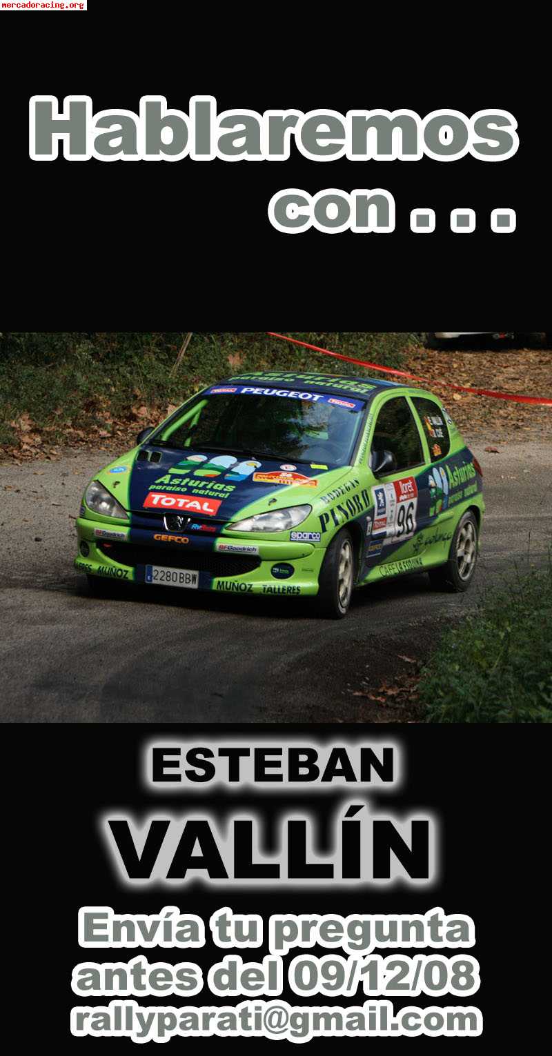 Después de cumplir nuestro primer año en la red, queremos comenzar a dar más participación a nuestra audiencia. Con esta idea queremos empezar con una iniciativa demandada por más de uno. Dentro del un programa de participación hablaremos con el piloto asturiano Esteban Vallín, actual subcampeón del Desafío nacional y un viejo conocido en el mundo de los Rallyes nacionales, pero no lo haremos solos queremos que nos enviéis vuestras preguntas*, seleccionaremos 10 de las preguntas más representativas y Esteban las responderá para vosotros. Más adelante sumaremos a más pilotos a esta iniciativa.