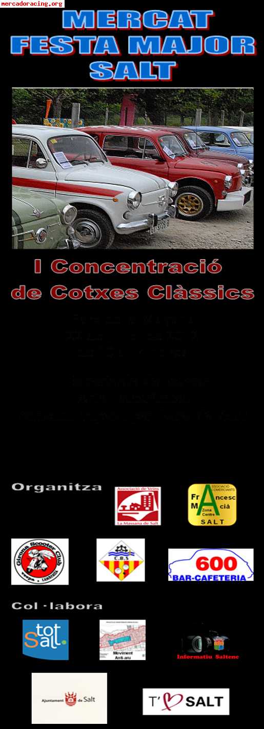 05-Jul-2012 13:14 Mercat Festa Major Salt I concentració de cotxes clàssics Parc de la Maçana 22 de juliol de 10 a 14 hores Espectacle de carrer Ruta panoràmica Gimcama tapera per bars de Salt Tlf de contacte: 972405474 Aun nadie ha indicado que le gusta esto