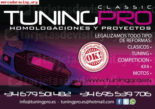 [quote:ebfeaa6048]Tuningpro, empresa dedicada a la homologacion de vehículos de todo tipo, ofrece toda la experiencia de su grupo de profesionales a un precio inmejorable y en un tiempo récord. Estamos situados en la zona del Levante Español y trabajamos con toda España. Si tienes alguna consulta no dudes en contactar con nosotros via mail, msn, o telefonicamente.